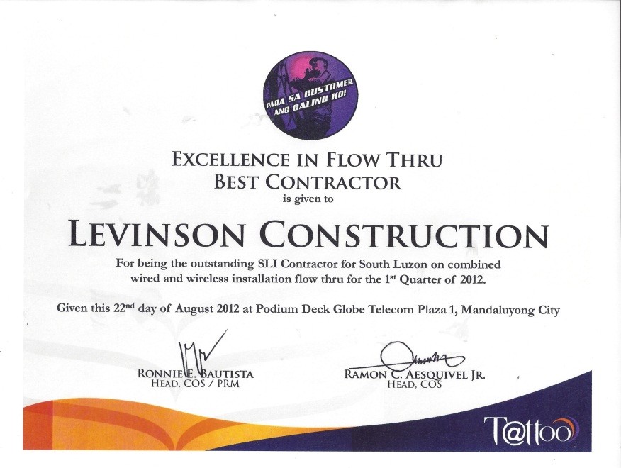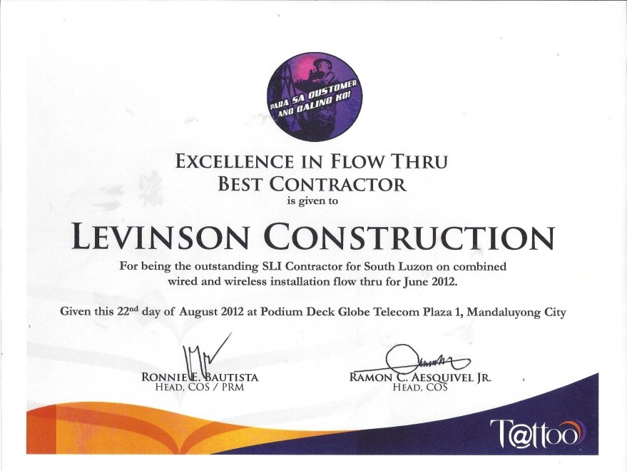 Excellence in Quality of Installation and Repair Best Contractor - Levinson South Luzon 1B 3rd Quarter 2012