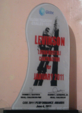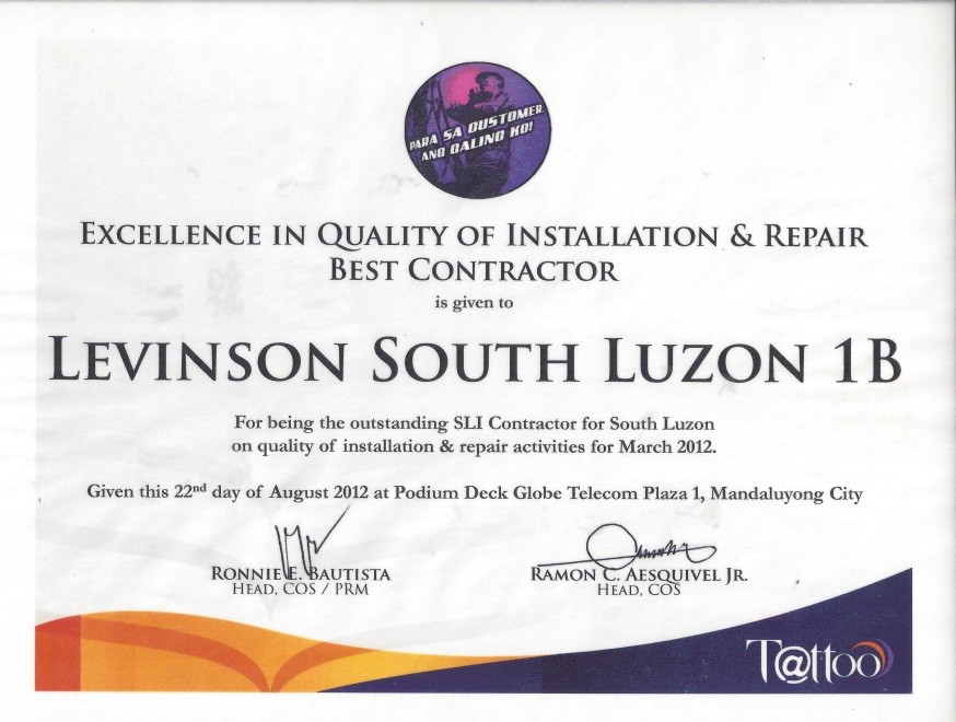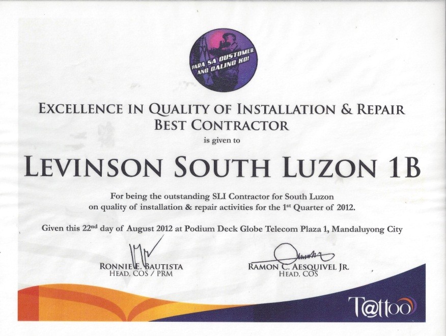 Excellence in Quality of Installation & Repair Best Contractor Levinson South Luzon 1B 1st Quarter 2012