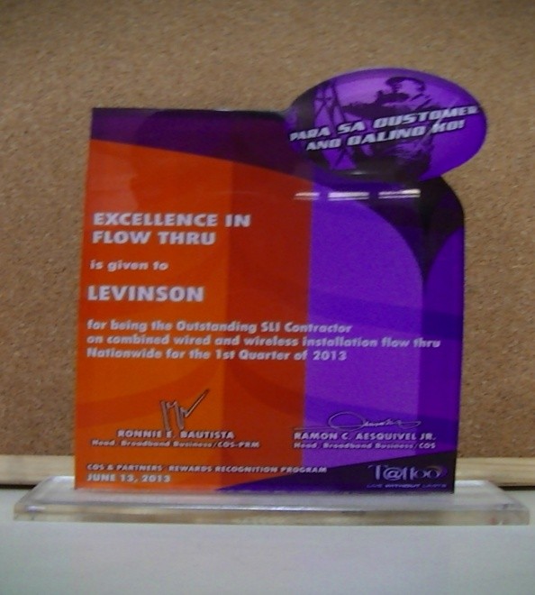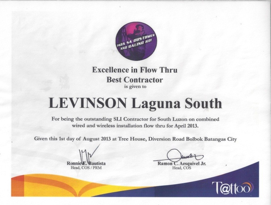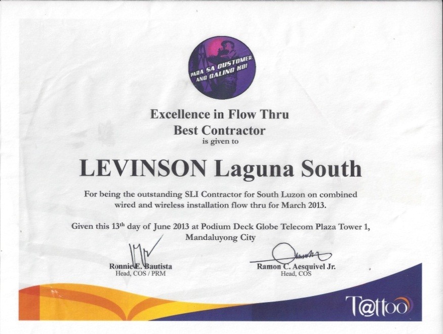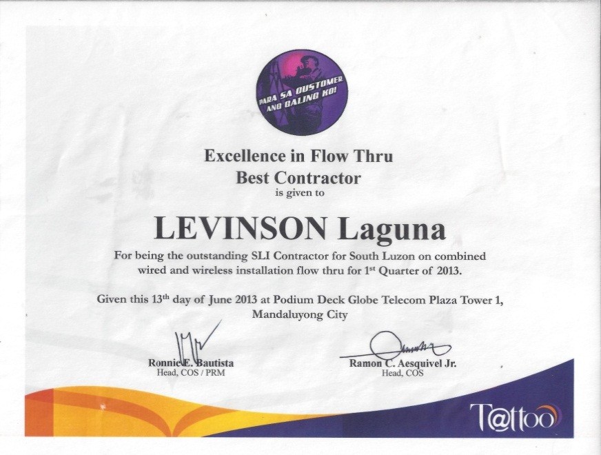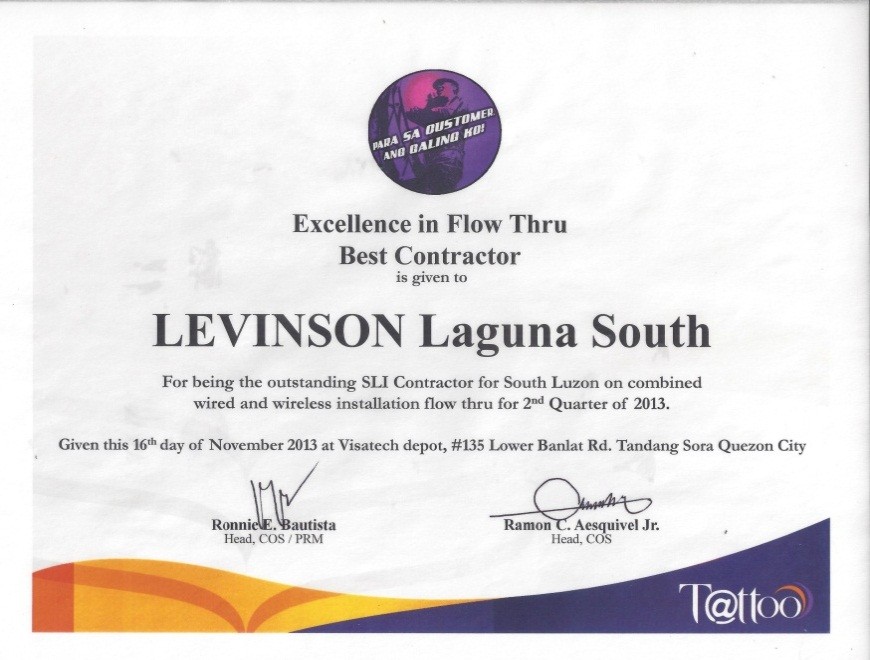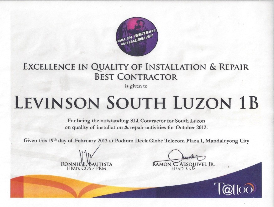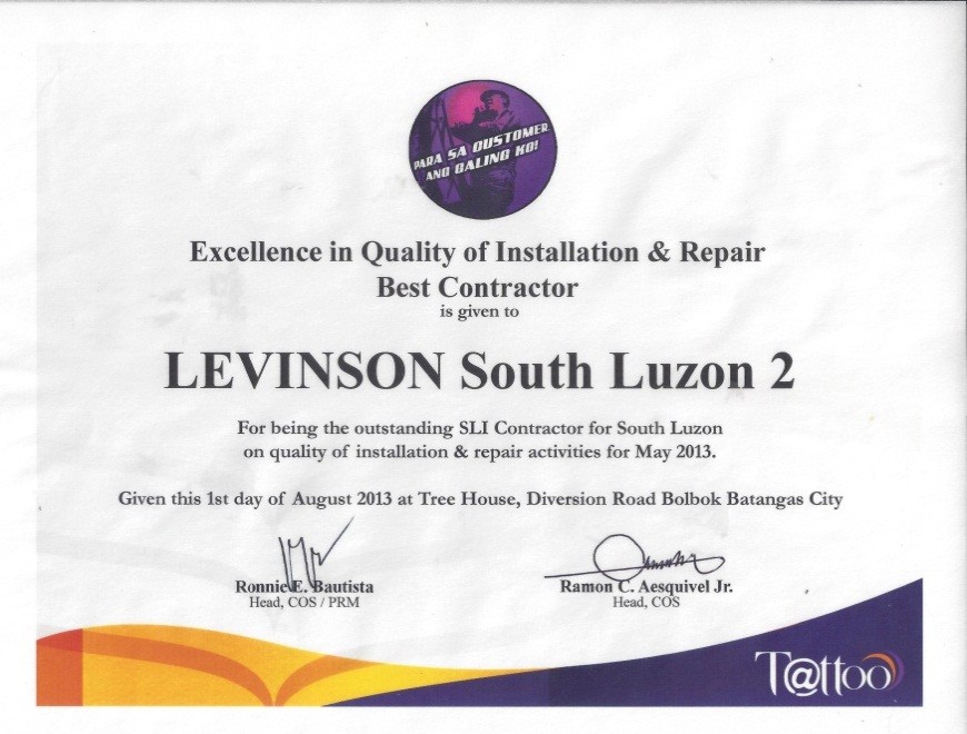Excellence in Quality of Installation & Repair Best Contractor Levinson South Luzon 2 2nd Quarter 2013