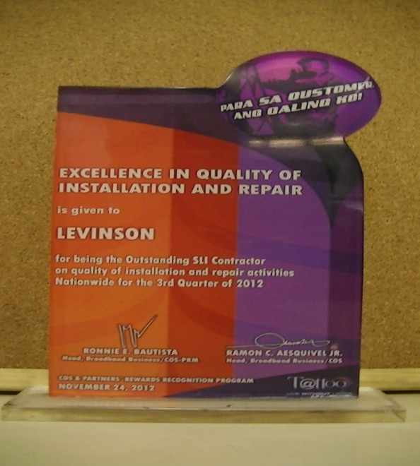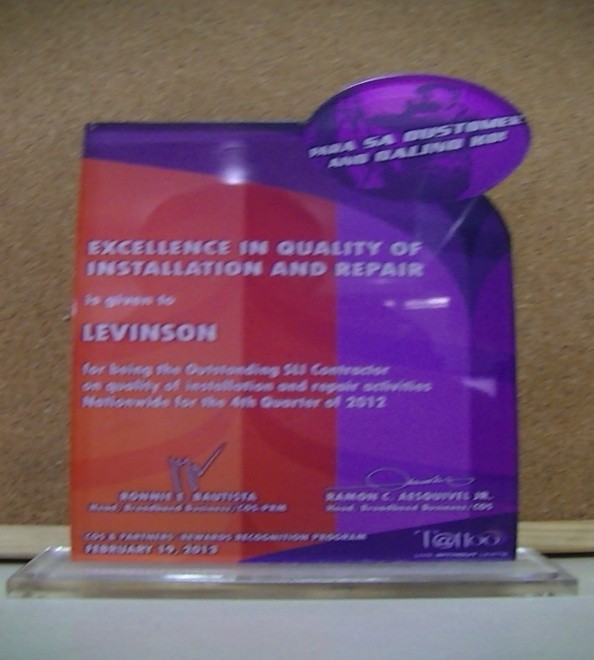 Excellence in Quality of Installation & Repair Best Contractor Levinson South Luzon 1B 4th Quarter 2012