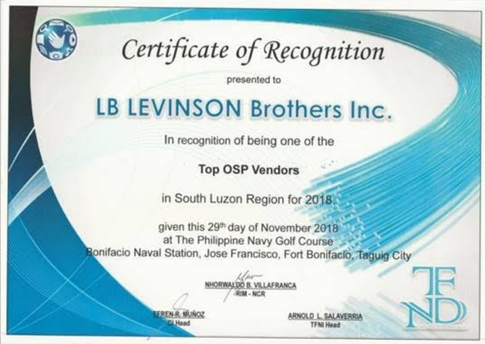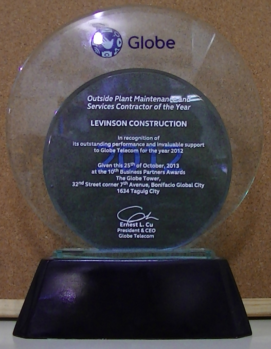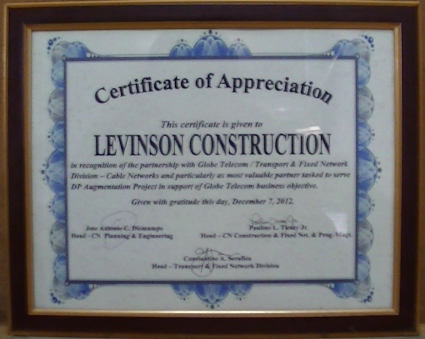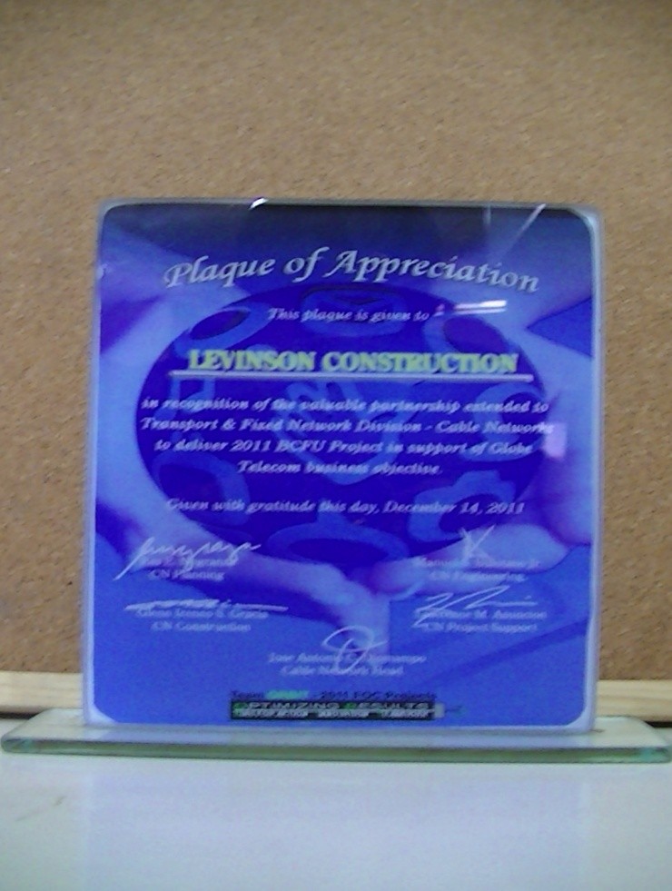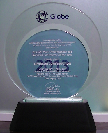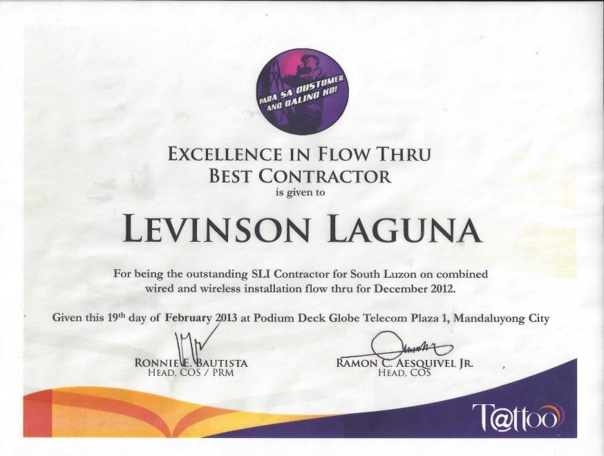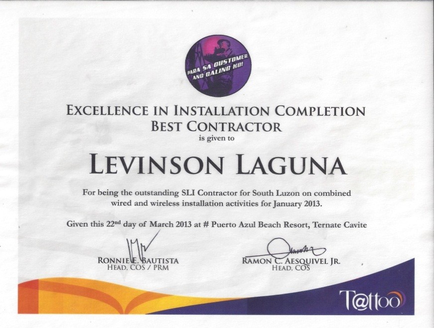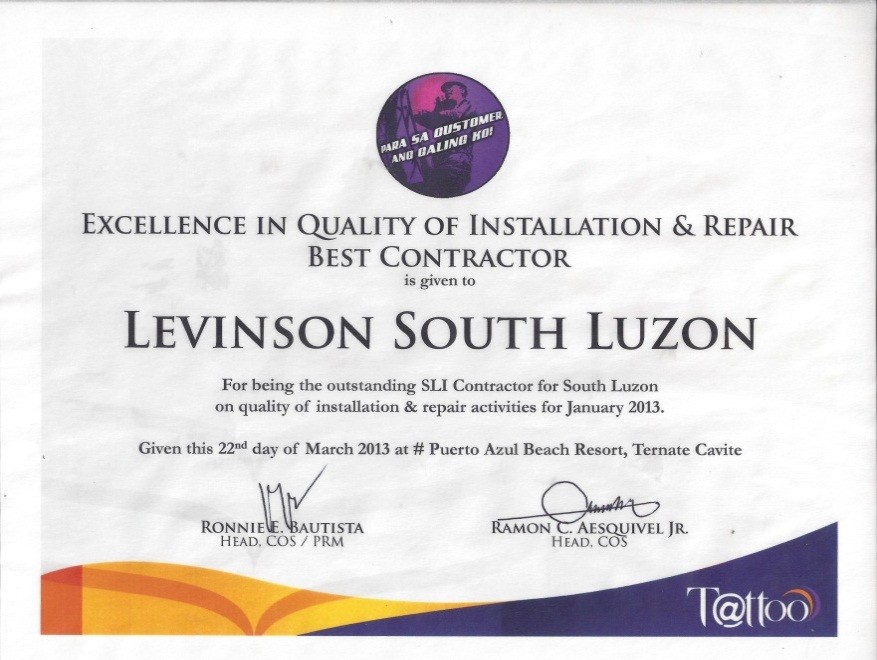 Excellence in Quality of Installation & Repair Best Contractor Levinson South Luzon January 2013