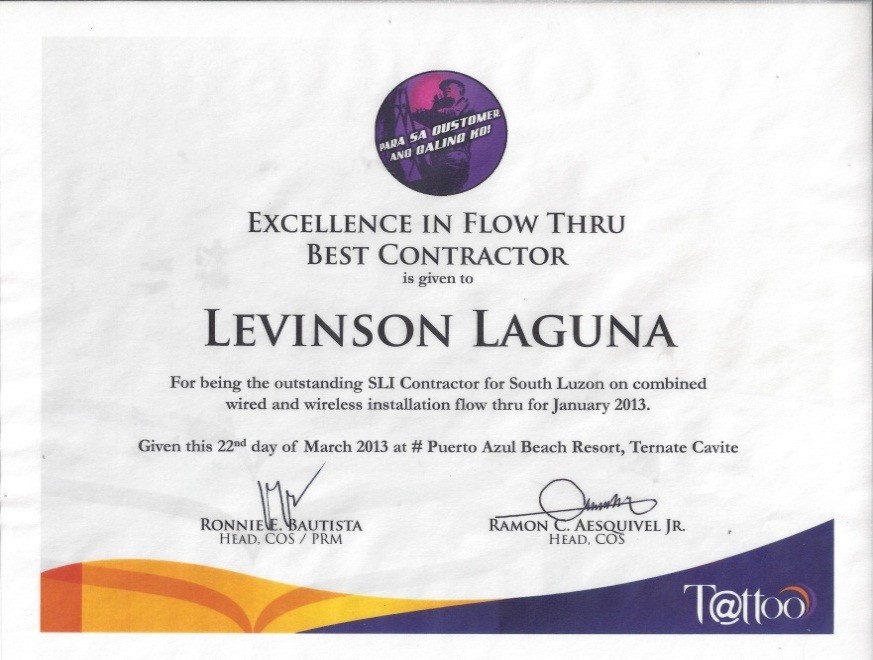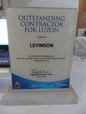 Excellence in Quality of Installation & Repair Best Contractor Levinson South Luzon 2 April  2013