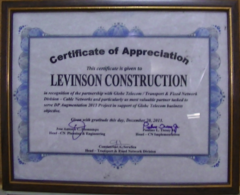 Excellence in Quality of Installation & Repair Best Contractor Levinson South Luzon 2 June 2013
